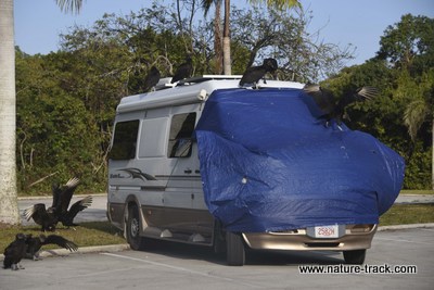 To access the remainder of the Everglades we had to go to Homestead and then head west. You will enter the park near the Ernest Coe Visitor Center. Just a few miles down the road is a turn-off to Royal Palms, the Anhinga Trail and the famous car-eating black vultures. That last part is no joke. When we visited about seven years ago, vultures caused over $300 damage to our rental car when they ate the rubber seals around the doors. Now, to the great frustration of the vultures, the Park Service provides blue tarps and bungee cords to cover your car with.