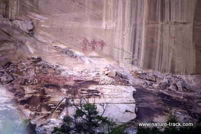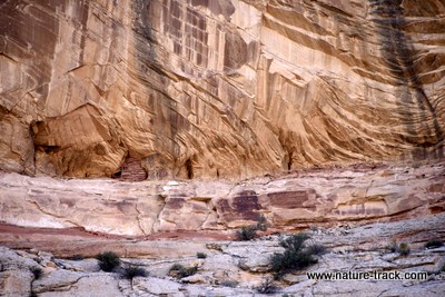 Along the trail are 12 numbered stakes, with the first being near the beginning and the last being at the falls. If you will pick up the free brochure at the trailhead registration, you will be able to read about what each number represents including some pictoglyphs and a Fremont Indian granary on the opposite cliffs. It is possible that you can spot them anyway, but they aren’t obvious and the numbers and brochure really help.