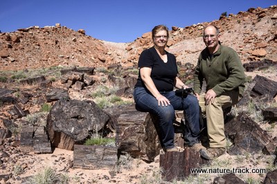Cathy stands on top of a fallen and petrified log. Weathering has just begun to expose this log which was buried under over 100 feet of rock.